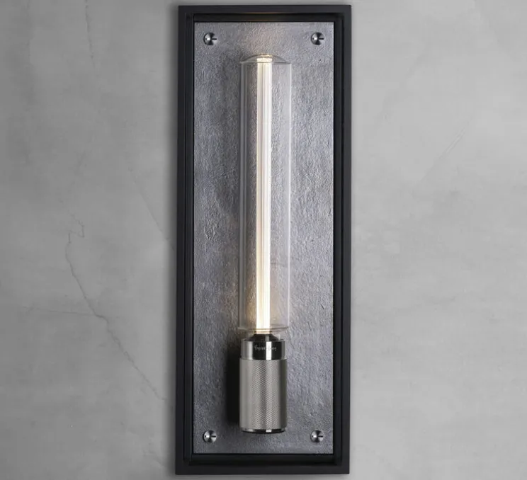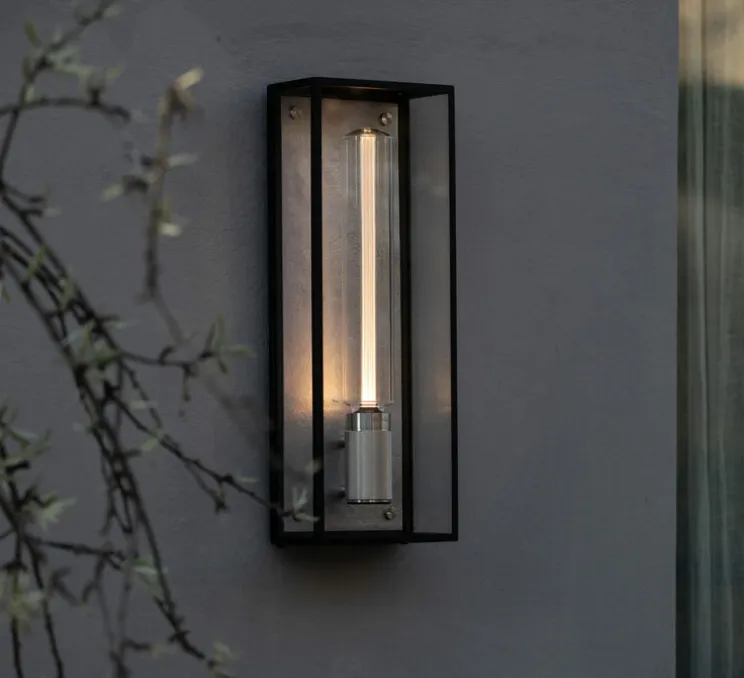 Cette applique murale est constituée d’une structure en métal associée à un abat-jour en verre noir mat, complété par un panneau arrière en métal moulé de couleur sable. Elle est équipée d’une douille en métal massif à molette croisée, fixée avec nos vis à tête de pièce de monnaie. Avec une classification IP44 et en conformité avec les normes ADA, elle convient parfaitement aux environnements humides, aux salles de bains et à une utilisation en extérieur. Disponible en acier, laiton et métal renforcé, la partie supérieure et inférieure de la cage est fabriquée en métal noir mat, présentant des perforations pour assurer un drainage efficace et éviter toute accumulation d’eau ou d’humidité.
