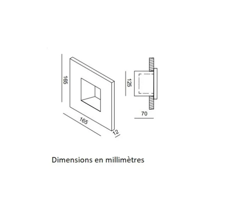 Son format encastré trouve sa place sur vos façades, le long de votre terrasse, ou encore votre escalier d’extérieur. L’applique mesure 16,5cm de hauteur et 16,5 cm de longueur. Le diamètre d’encastrement est de 12 cm de hauteur pour 7 cm de profondeur.