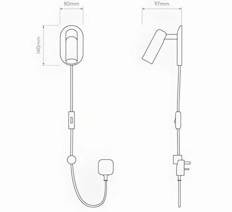 La liseuse Gio est dotée d’un câble noir de 2,5 mètres avec prise et interrupteur. Elle fonctionne avec une ampoule GU10 LED de 4W max (non incluse). L’éclairage est orientable, direct et non dimmable.