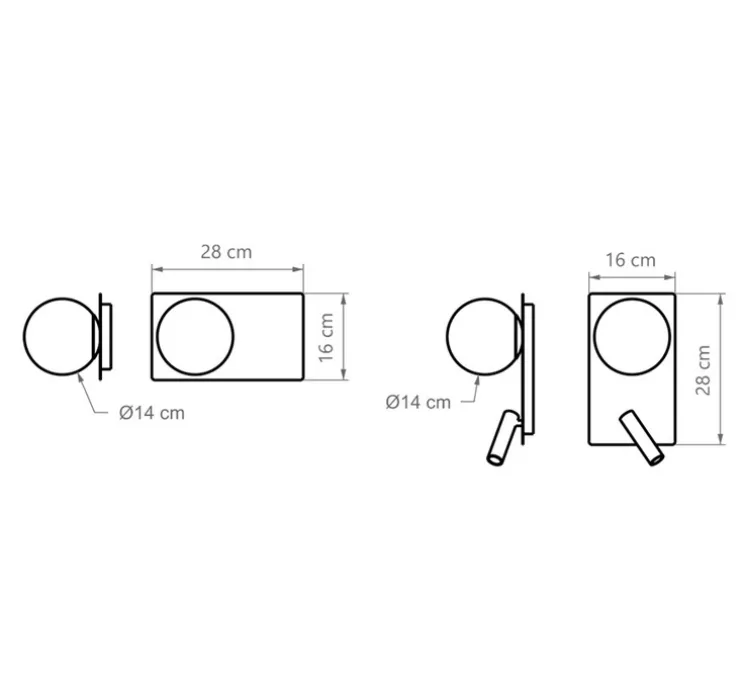 L’applique Glos combine une source lumineuse principale avec ampoule E14 et une liseuse LED intégrée de 2W, émettant une lumière de 2700K avec 150 lumens. Elle mesure environ 28 cm de hauteur, avec un globe de 14 cm de diamètre, et se fixe facilement au mur.