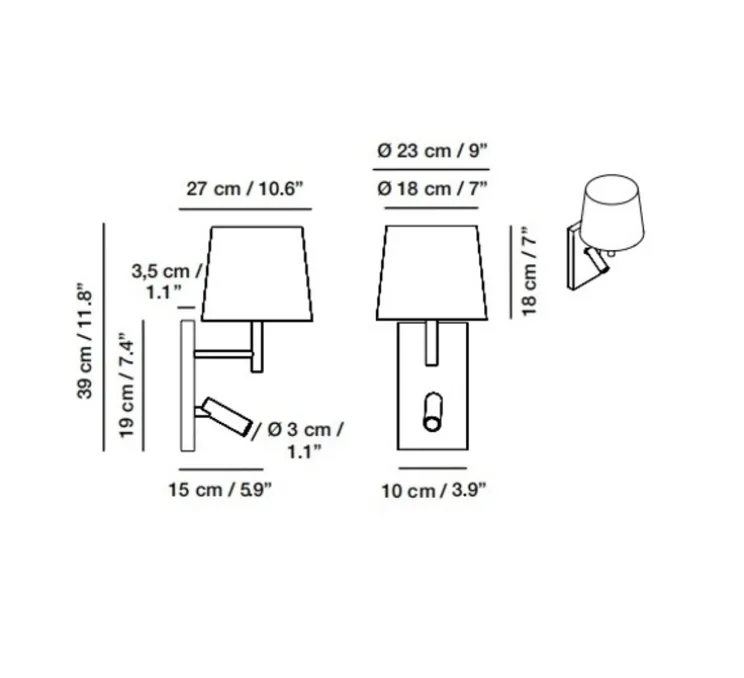 Jerry Hotel possède un abat-jour dont le haut mesure 18cm et le bas 23cm de diamètre et possède un angle d’éclairage de 80°. Le tube lumineux est quant à lui rotatif à 360°.