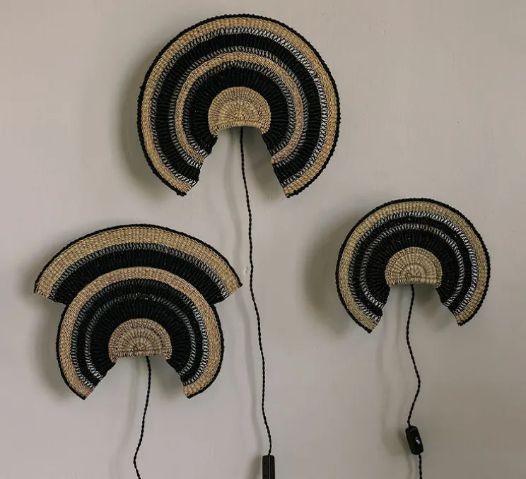 Le luminaire Admirador se compose d’une base murale avec câble et interrupteur et d’un abat-jour tissé plat, dont la forme reprend la forme du classique éventail Bolga. L’abat-jour est tissé à la main par des artisans selon l’art du tissage Bolga, artisanat typique de la région de Bolgatanga dans le nord du Ghana. Le matériau utilisé pour le tissage est une herbe, l’herbe Veta Vera : elle est cultivée localement et récoltée pour ensuite être torsadée et tordue, jusqu’à créer des fibres résistantes et lisses, qui seront finalement teintes avec des pigments naturels. Le rythme du tissage laisse passer les rayons de la lumière, pour apporter une touche de douceur et de naturel à chaque intérieur. Naturelle et belle, l’applique Admirador s’installe aussi bien dans une chambre, que dans un couloir ou d’une pièce de vie.