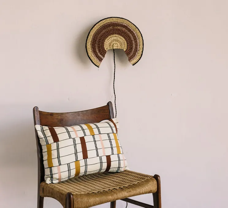 Le luminaire Admirador se compose d’une base murale avec câble et interrupteur et d’un abat-jour tissé plat, dont la forme reprend la forme du classique éventail Bolga. L’abat-jour est tissé à la main par des artisans selon l’art du tissage Bolga, artisanat typique de la région de Bolgatanga dans le nord du Ghana. Le matériau utilisé pour le tissage est une herbe, l’herbe Veta Vera : elle est cultivée localement et récoltée pour ensuite être torsadée et tordue, jusqu’à créer des fibres résistantes et lisses, qui seront finalement teintes avec des pigments naturels. Le rythme du tissage laisse passer les rayons de la lumière, pour apporter une touche de douceur et de naturel à chaque intérieur. Naturelle et belle, l’applique Admirador s’installe aussi bien dans une chambre, que dans un couloir ou d’une pièce de vie.