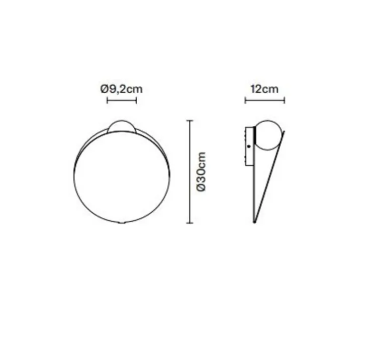Cette applique à l’allure graphique est composée de deux disques en métal, contenant un diffuseur de forme sphérique en verre soufflé.