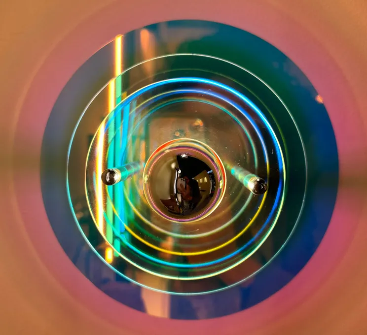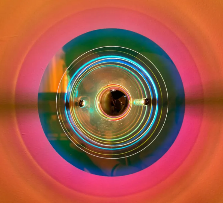 Son verre irisé capte la lumière et la projette en reflets délicats sur le mur, créant une atmosphère en constante évolution selon l’heure de la journée. De forme circulaire, avec trois disques de tailles différentes, cette applique évoque un halo mouvant, rappelant la suspension Venise.