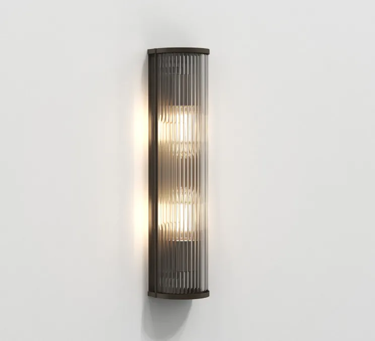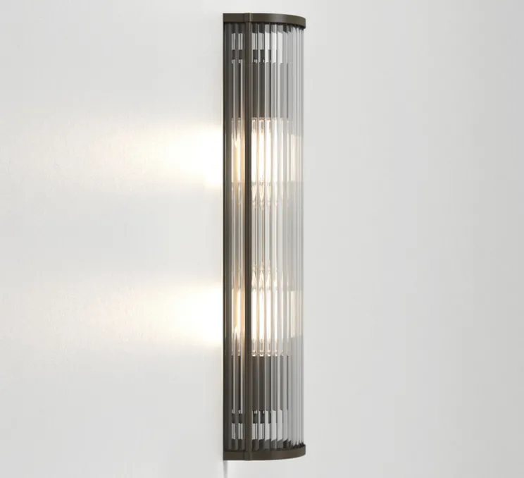 Son profil arrondi défini par des tiges en verre transparent et sa finition en laiton antique apportent une touche de luxe et permettent une diffusion plus douce que son homologue en bronze. L’éclairage est vif mais confortable et sans éblouissement. Elle trouve sa place dans tous les types d’espaces même ceux combinant des couleurs sombres dans lesquels elle apportera une lueur riche et chaleureuse. Elle est notamment pensée pour les milieux hôteliers. L’applique se fixe au mur grâce à une vis discrète n’enlevant rien à son esthétique uniforme.