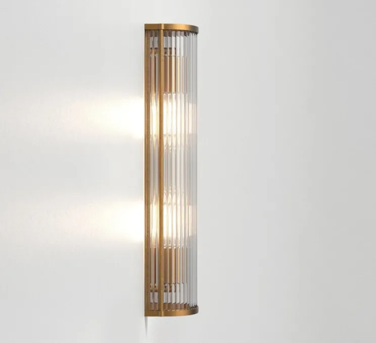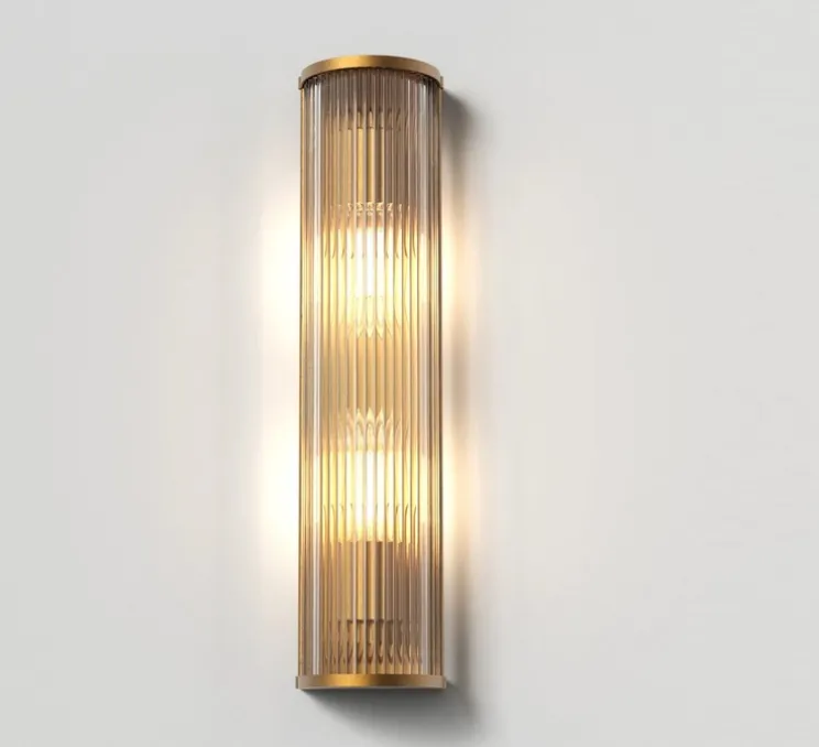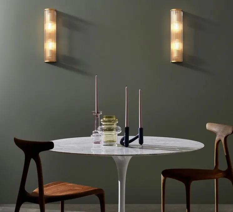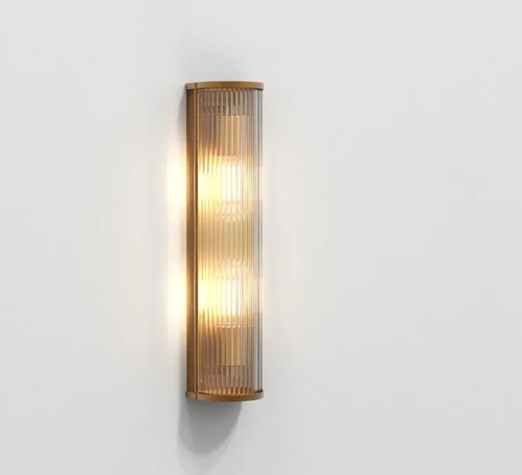 Son profil arrondi défini par des tiges en verre transparent et sa finition en laiton antique apportent une touche de luxe et permettent une diffusion plus douce que son homologue en bronze. L’éclairage est vif mais confortable et sans éblouissement. Elle trouve sa place dans tous les types d’espaces même ceux combinant des couleurs sombres dans lesquels elle apportera une lueur riche et chaleureuse. Elle est notamment pensée pour les milieux hôteliers. L’applique se fixe au mur grâce à une vis discrète n’enlevant rien à son esthétique uniforme.