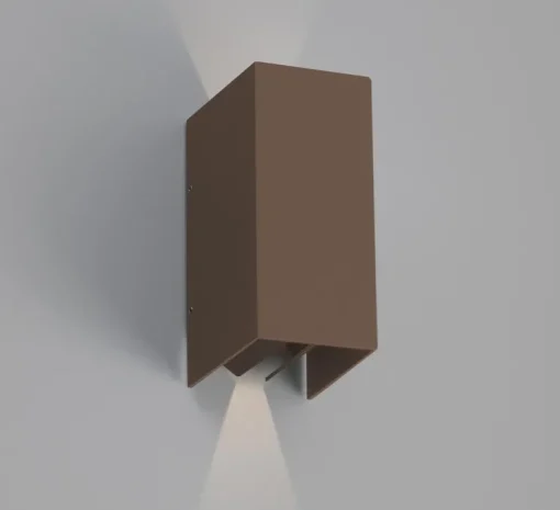 Cette applique de couleur rouille est réalisée en aluminium et en verre pour le diffuseur.