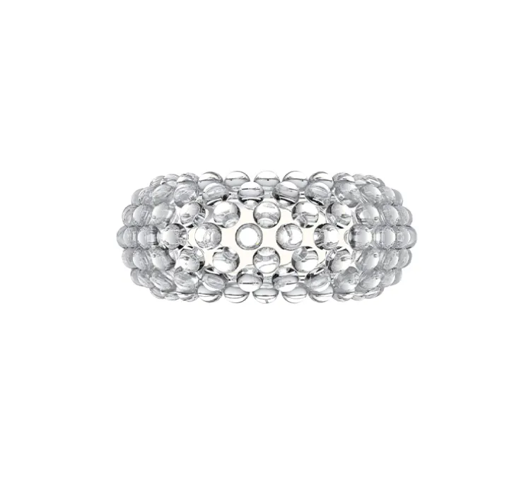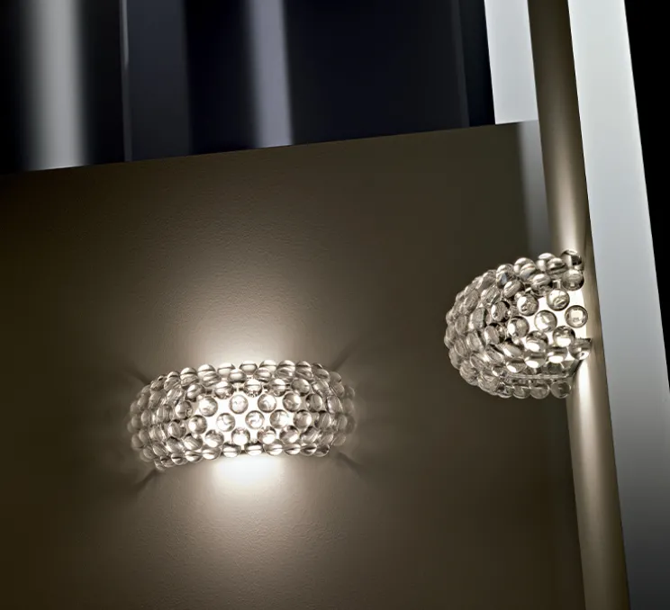 Des perles de lumière flottant dans l’espace : l’applique Caboche Plus est composée d’une structure sur laquelle se monte une multitude de sphères et d’un support de montage. La structure est faite d’arceaux en zig-zag, tout simplement invisibles, ne masquant ni la lumière, ni le regard ; exaltant la transparence tout en améliorant la résistance. Un système simple d’ancrage twist-lock permet un montage facile et stable des sphères sur la structure. Une fois les sphères montées, la structure disparaît complètement de la vue ; les sphères semblent flotter dans le vide, dans un superbe effet de transparence totale. Aussi précieux, sophistiqué et léger qu’un bracelet de perles, Caboche est un bijou de transparence et de luminosité, au caractère unique. Allumée, la lumière du luminaire se diffuse à travers une mosaïque de réfractions, éclairant l’espace dans toutes les directions. Caboche décore et illumine les intérieurs les plus classiques comme les plus contemporains, s’intégrant facilement dans un salon, comme dans une chambre ou une entrée.