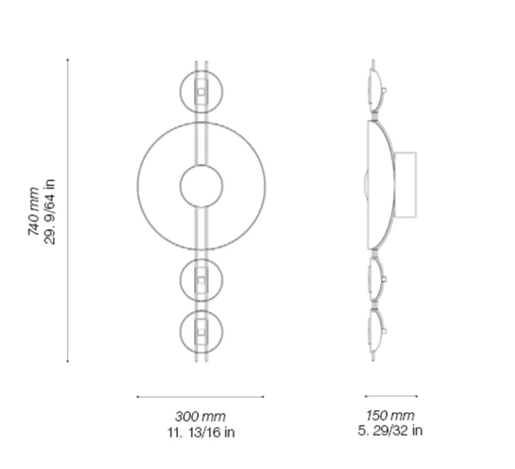 L’applique Cropcircle mesure 30 cm de longueur, 74 cm de hauteur et 15 cm de profondeur. L’ampoule LED G4 intégrée d’une puissance de 7,5W diffuse 420 lumens avec une colorimétrie de 2700K (blanc chaud). Non dimmable.