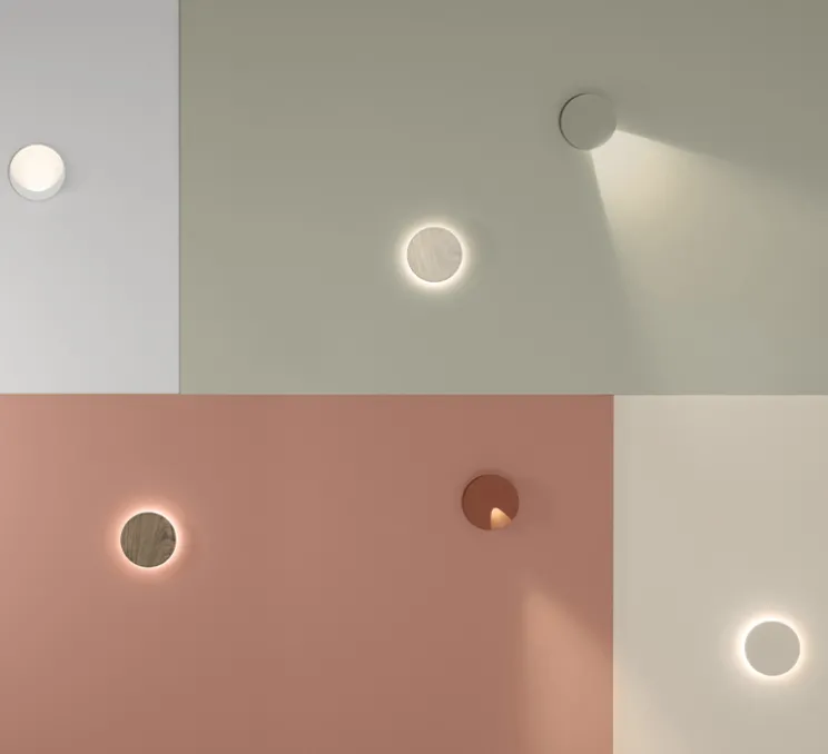 Dots est disponible en appliques murales dans une variété d’options, dans différentes finitions de bois et différents coloris de la gamme Chromatica de Vibia.