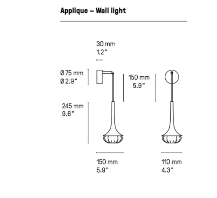 L’applique mesure 24,5cm de hauteur et 15cm de longueur. Pour une utilisation optimale, nous préconisons une source de lumière LED, ampoule G9 (non inclue).