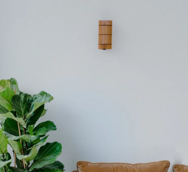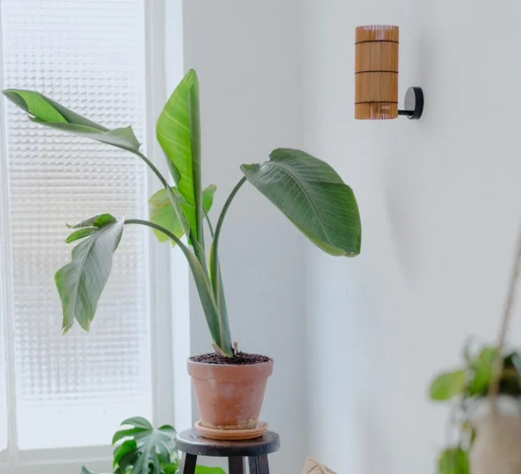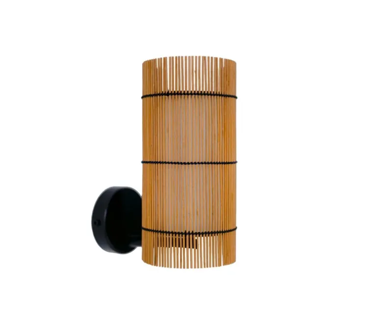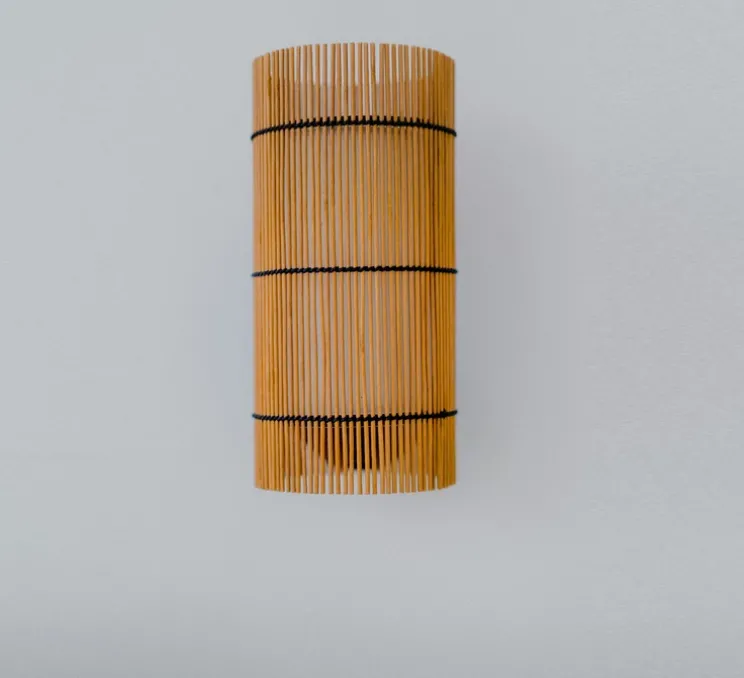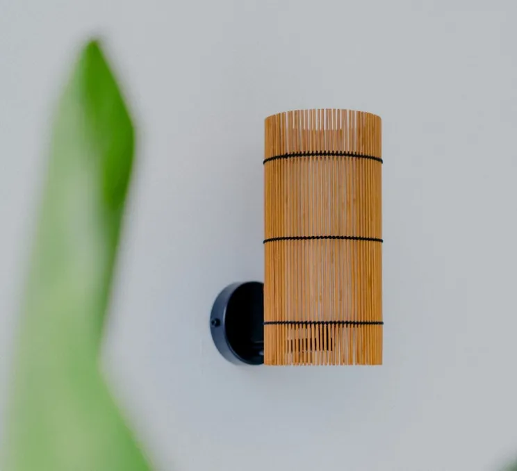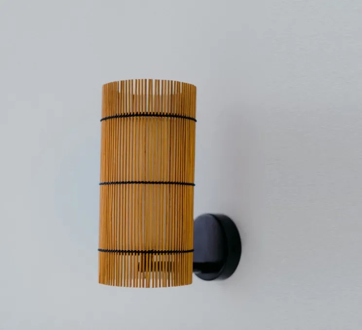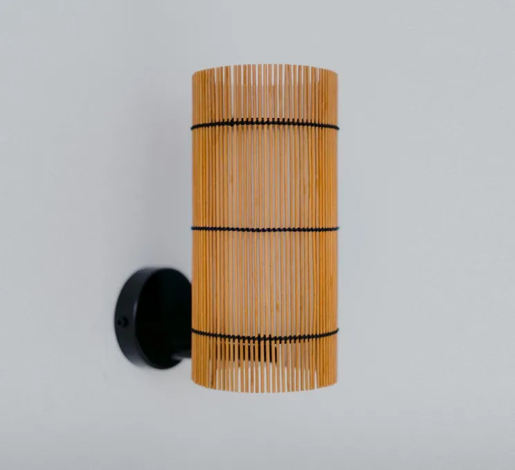 Les lampes de la collection Foc sont composées de deux abat-jour. Un premier abat-jour extérieur en bambou teinté cerisier entrelacé d’un fil noir. Cet abat-jour donne un effet unique et perméable aux lampes.