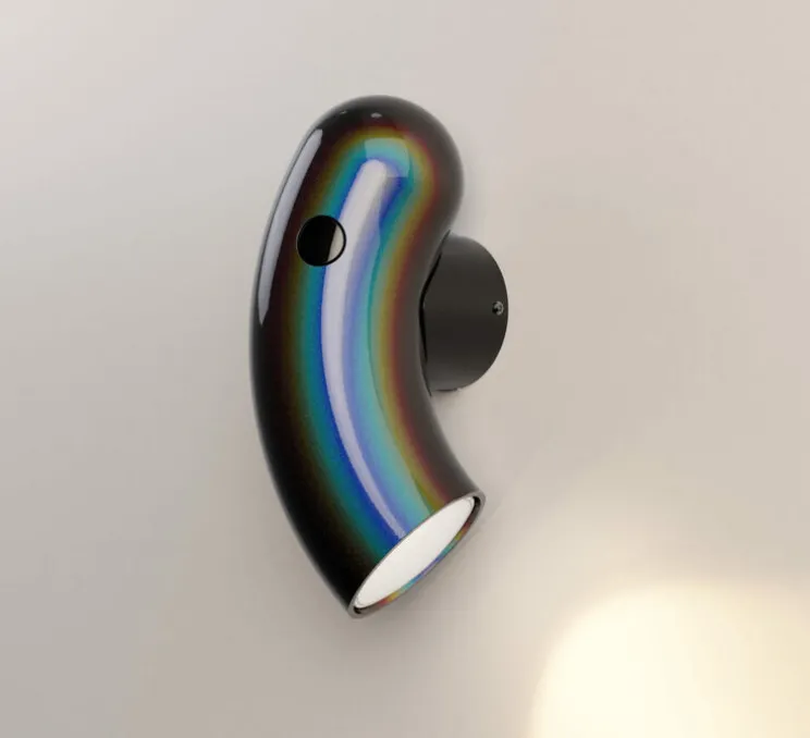 Par son revêtement noir chromatique, l’applique prend différentes teintes en fonction de son environnement. C’est alors un véritable jeu de lumière qui s’installe et qui varie tout au long de la journée. Dans un salon ou dans une chambre, Hyphen unit les opposés pour créer de l’harmonie. Sa couleur irisée donne alors vie au luminaire pour offrir une présence magique. Grâce à ses versions droite et gauche, l’applique Hyphen est aussi idéale en tête de lit.