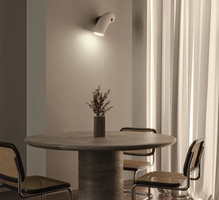 Dans sa version en porcelaine blanche mate, l’applique s’intègre dans son environnement en apportant de doux reflets. Dans un salon ou dans une chambre, Hyphen unit les opposés pour créer de l’harmonie et une atmosphère chaleureuse. Grâce à ses versions droite et gauche, l’applique Hyphen est aussi idéale en tête de lit.