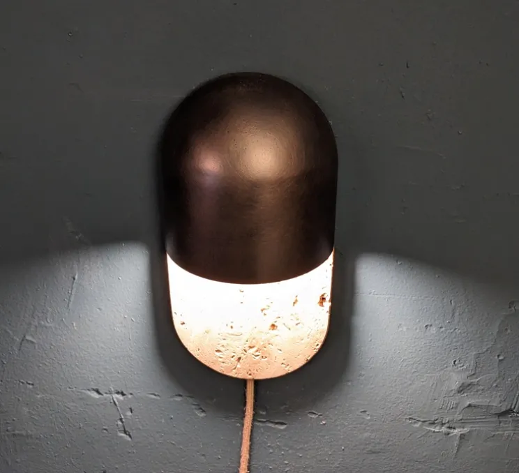 Découvrez l’applique Martel 300 en Bronze patiné marron foncé et travertin de la maison d’édition familliale et française Entrelacs !