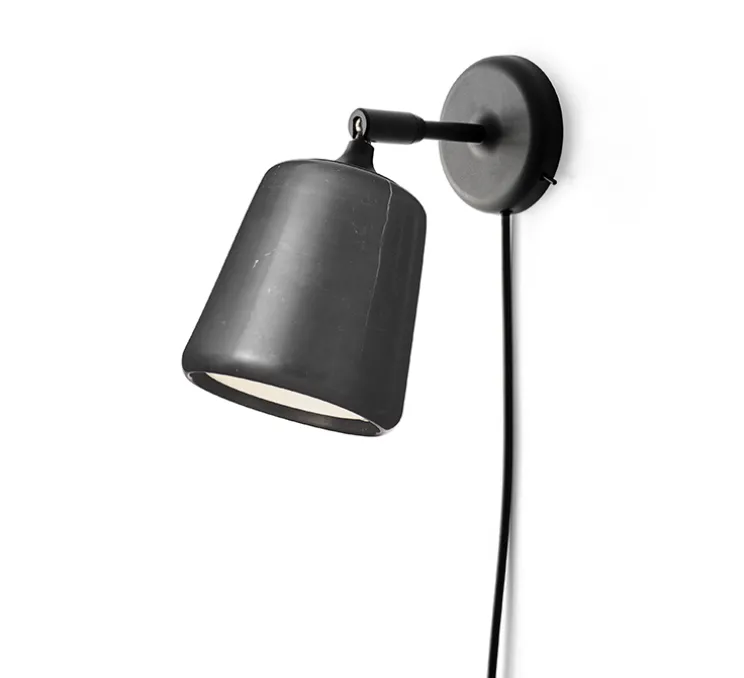 Le luminaire Material est composé d’un abat-jour pivotant en marbre noir de forme organique et d’une base murale avec interrupteur et câble. Minimaliste et étonnante, Material s’intègre aisément dans chaque intérieur, que ce soit en tête de lit dans une chambre, sur un mur dans une entrée ou un coin lecture.