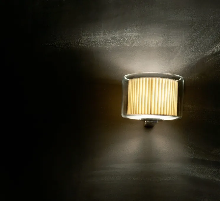 Le modèle Mercer propose ici une version particulièrement chic de l’applique classique avec un effet double-peau associant le verre soufflé et le textile élégamment plissé.