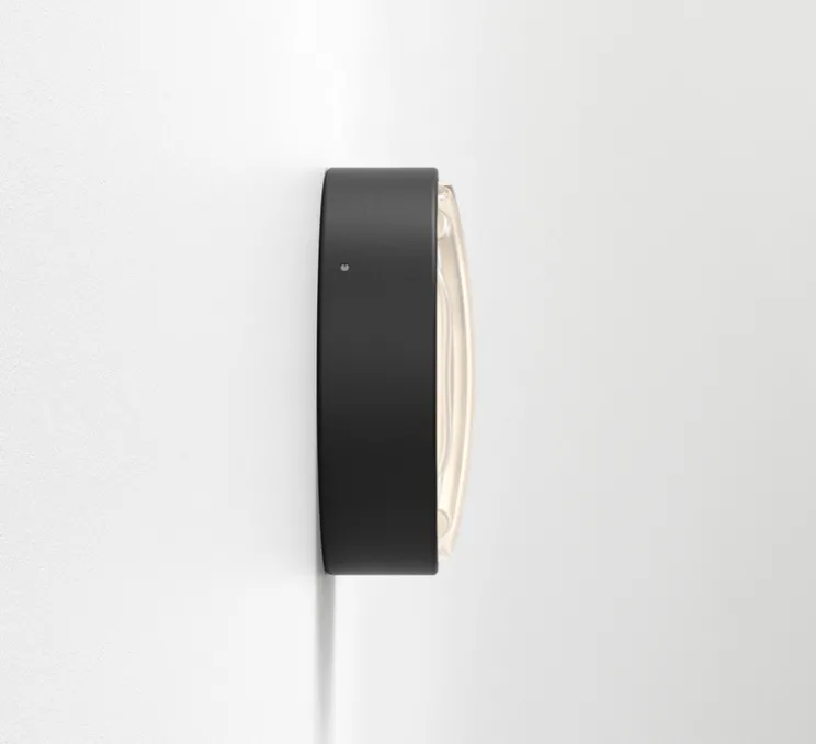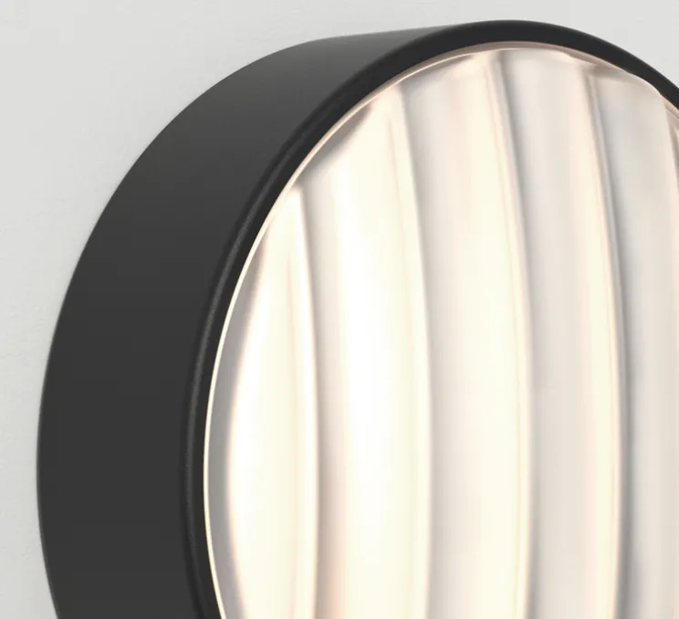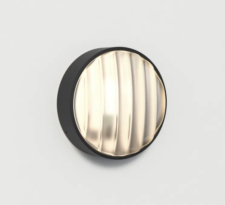 Découvrez l’applique murale d’extérieur Montréal Round 220, finition noir texturé, imaginée par le studio de la maison britannique Astro.
