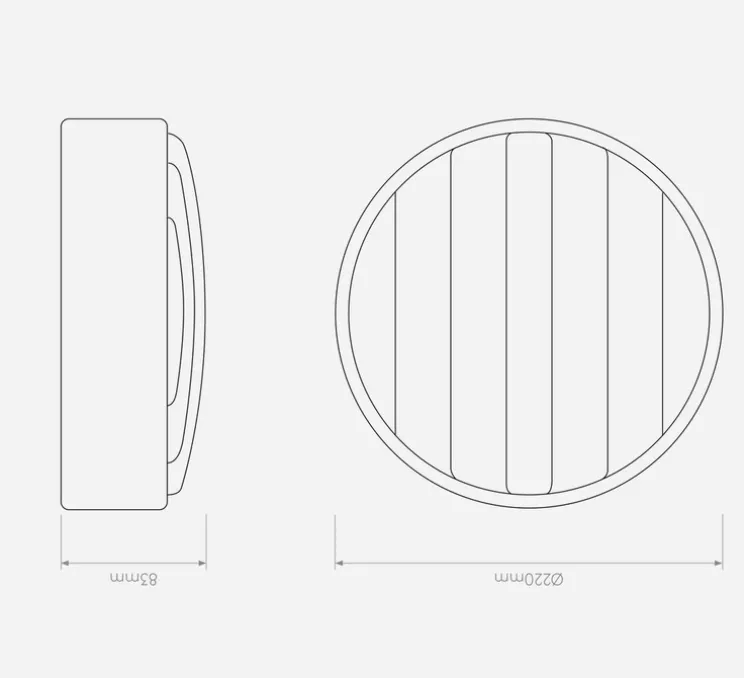 L’applique Montréal Round 220 mesure 22 cm de diamètre et 8,3cm de profondeur. L’ampoule LED E14 d’une puissance maximale de 7W n’est pas fournie mais est recommandée pour le bon fonctionnement du luminaire. Driver non requis. Montage mural vertical.
