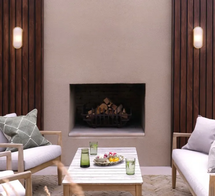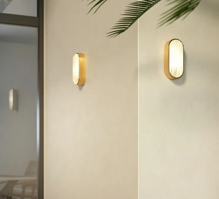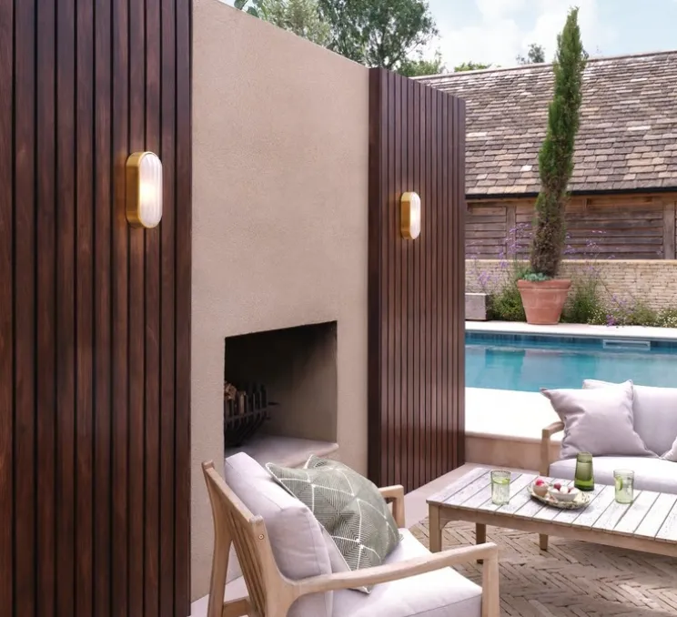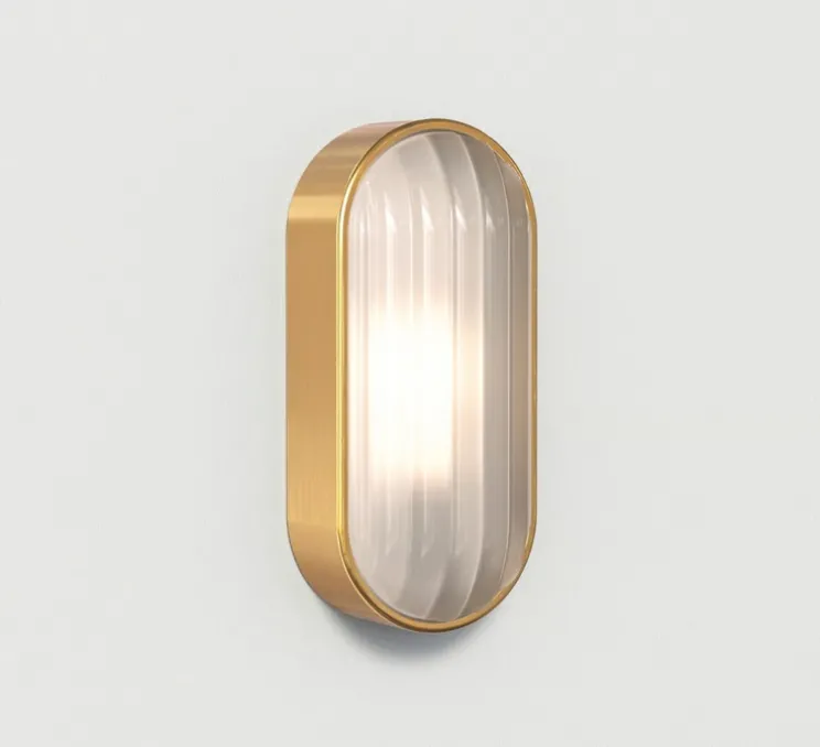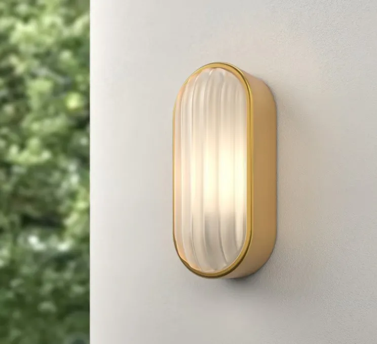 Découvrez l’applique murale d’extérieur Montreal Oval Coastal, finition laiton brossé PVD, imaginée par le studio de la maison britannique Astro.