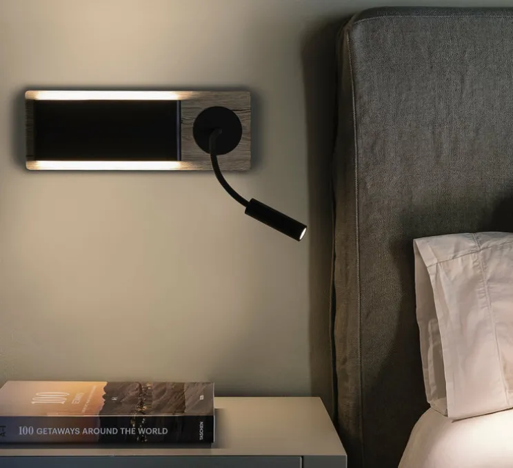 Cette applique murale est constituée d’une liseuse en métal rectangulaire noire posée sur une plaque en chêne qui donne de la chaleur à la pièce. De plus une deuxième liseuse orientable permet d’éclairer une zone précise.