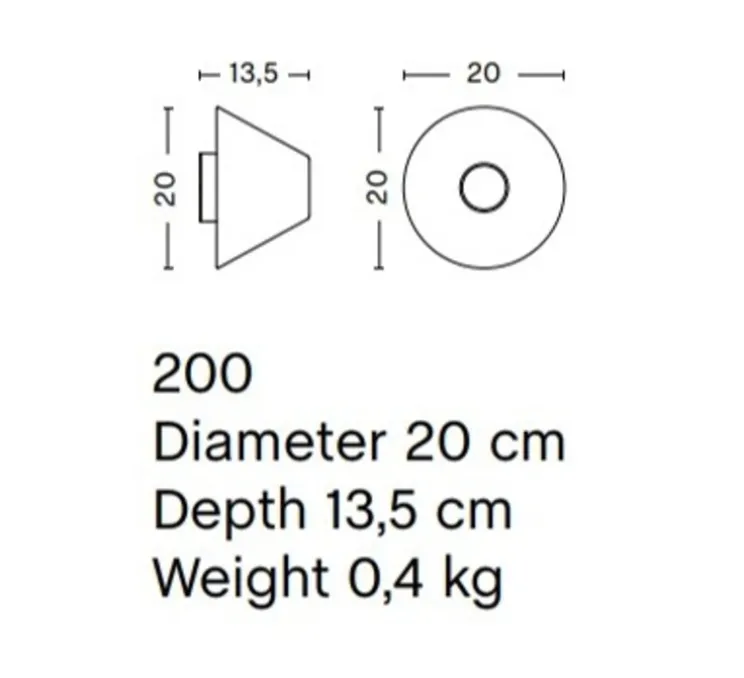 L’applique mesure 20 cm de diamètre et 13,5 cm de profondeur. La source lumineuse n’est pas fournie, nous recommandons une ampoule E14, 8W max.