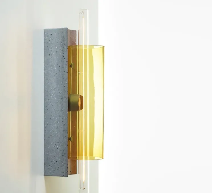 L’applique se compose d’une base en béton anthracite, légèrement incurvée pour accueillir un cylindre en verre soufflé ambre. La source lumineuse se trouve au cœur de ce module en verre.