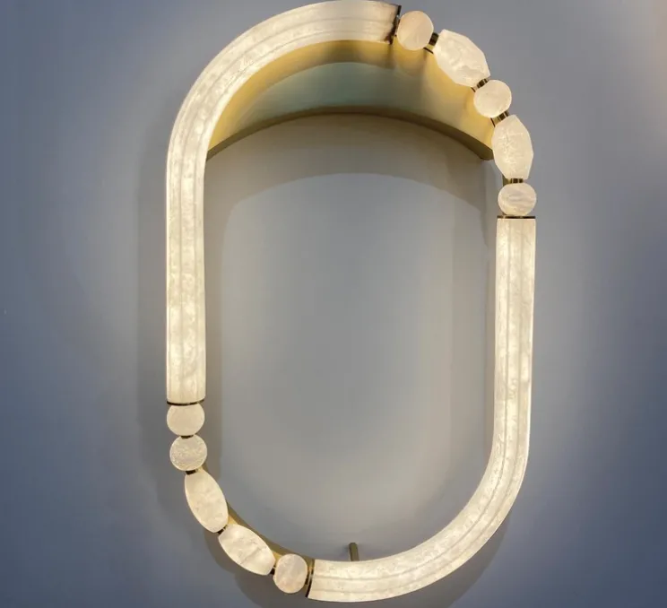 L’applique Pearl est un élément sculptural et architectural à part entière. Raffinée avec sa lune en laiton et ses perles d’albâtre, sa minéralité et ses teintes douces lui permettent de s’intégrer parfaitement aux murs et à l’architecture de la pièce. Elle diffuse une belle lumière à travers les perles d’albâtre, qui peut être intense ou tamisée selon vos envies.