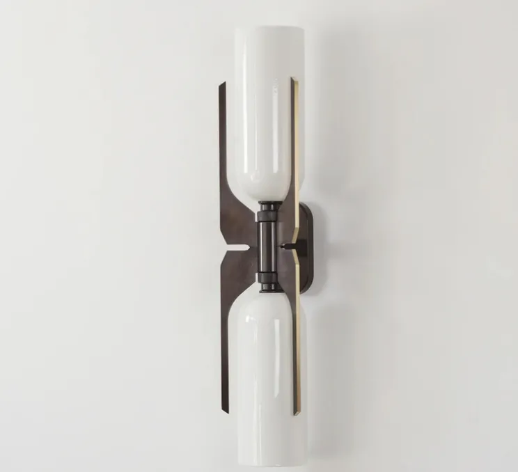 L’applique murale Pennon apporte élégance et raffinement à votre intérieur. Des ailettes en bronze habillent en parfaite symétrie deux diffuseurs en porcelaine fine.