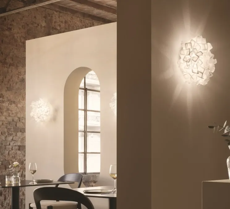 Clizia S reprend les formes de la nature : c’est un nuage qui capture la lumière du soleil aux premières heures du jour et qui se charge de reflets chatoyants, c’est la cime d’un arbre à travers laquelle filtre la lune en créant des jeux d’ombres. Clizia donne à votre environnement la lueur romantique des premières heures de l’aube. Avec sa forme peu commune Clizia s’intègre dans une chambre, un salon ou un bureau.