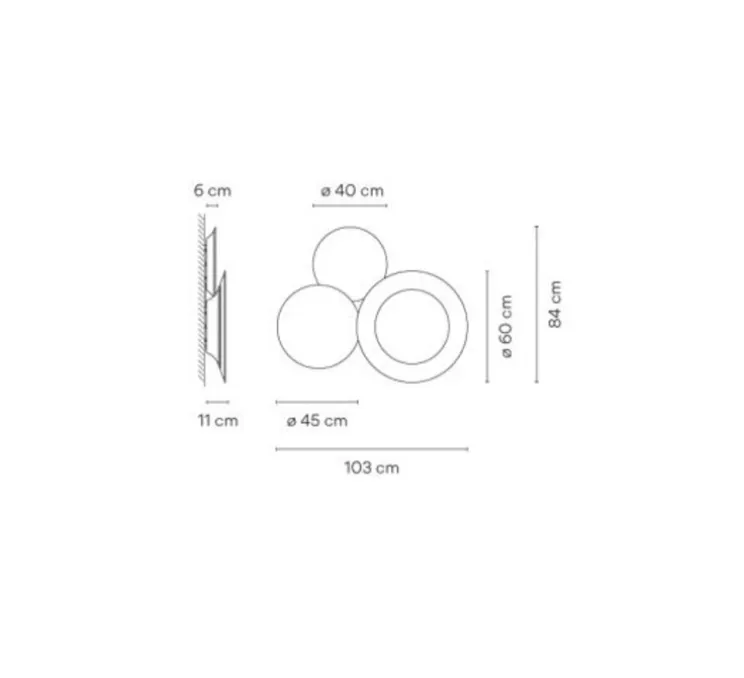 L’applique Puck a une hauteur de 84 cm, une longueur de 103cm et une profondeur de 11 cm. La triple applique possède une applique de ⌀40cm, une seconde de ⌀45cm et une grande applique de ⌀60cm. Les 3 sources LED strip sont incluses avec une puissance de 12.6W chacune. L’applique diffuse 2700K (blanc chaud) et 4307 lumens. Possède un IRC de 90 promettant un rendu des couleurs de qualité. Transformateur inclus. Dimmable en Push 1-10V.