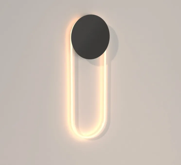 Ra Wall courte, se compose d’un disque fait tout en acier, qui éclipse une partie de la lumière et attire les reflets de la pièce. Le néon arrondi émet sur le mur une lumière brillante et douce, 3000k et 1200lm.