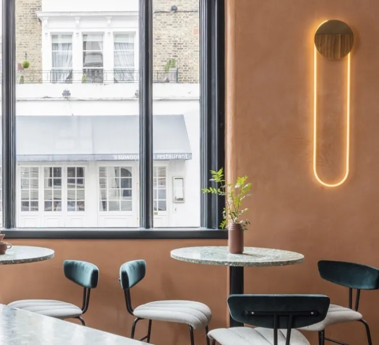 Ra est un disque fait tout en acier, qui éclipse une partie de la lumière et attire les reflets de la pièce. Le néon arrondi émet sur le mur une lumière brillante et douce, 2700k et 1900lm.