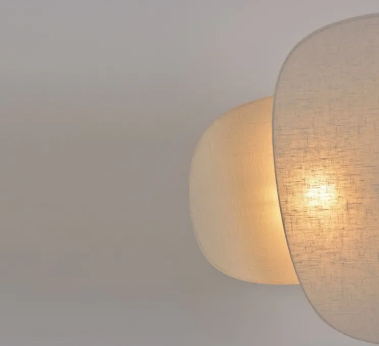La lampe à poser comprend une structure en métal peint ainsi que deux écrans en lin bouleau.