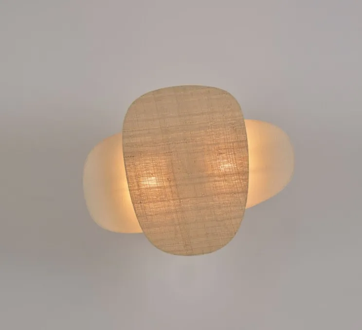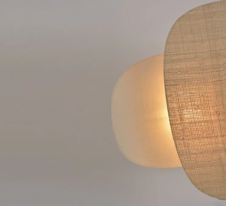 La lampe à poser comprend une structure en métal peint ainsi que deux écrans en lin bouleau et raphia.