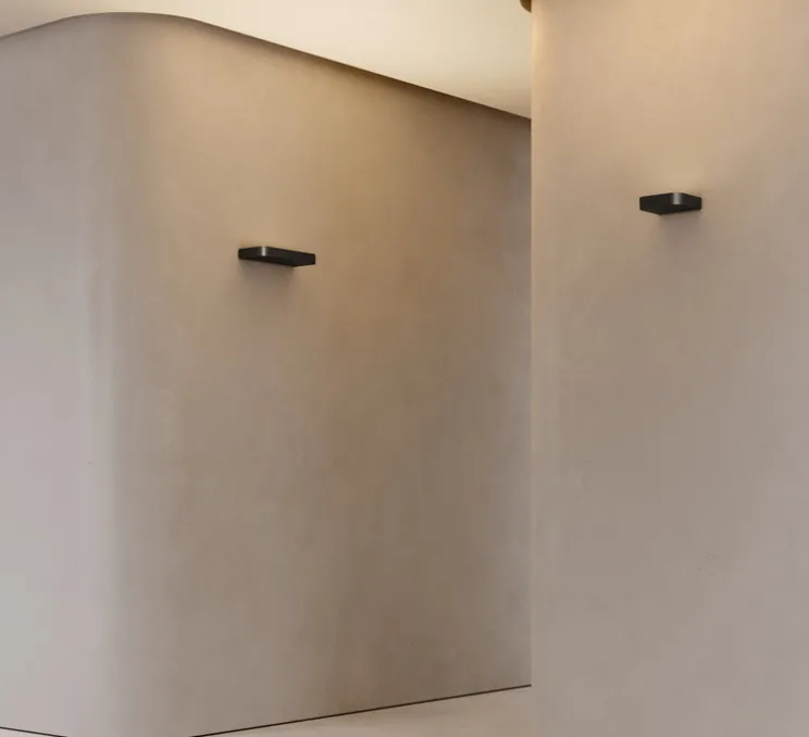 Avec sa forme cubique et son coloris noir mat, Shift présente un design discret qui s’intègre naturellement aux plafonds voûtés, cages d’escalier ou pièces aux volumes classiques. Le diffuseur, encastré dans la base, diffuse une lumière indirecte orientable qui valorise les surfaces sans envahir visuellement l’espace.