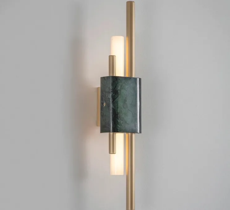 L’applique murale Tanto Wall Light – Small est faite de laiton, verre opale et de marbre vert du Guatemala. Mince mais dynamique, le Tanto Wall Light – Small combine deux barres asymétriques en laiton et une ampoule centrale cylindrique en opale.
