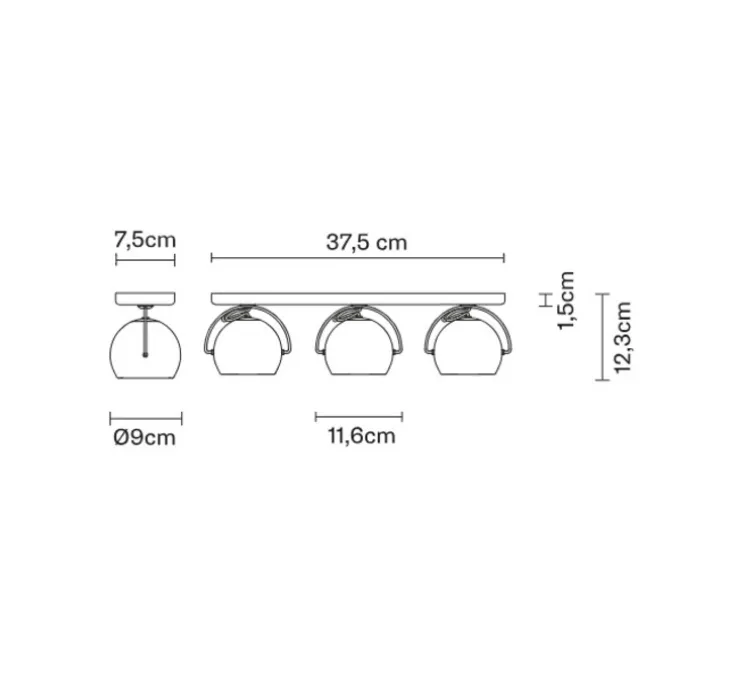 Cette lampe mesure 37,5cm de longueur, pour une hauteur de 12,3cm. Le diffuseur a un diamètre de 9cm. les 3 ampoules GU 10 ne sont pas incluses avec la lampe.