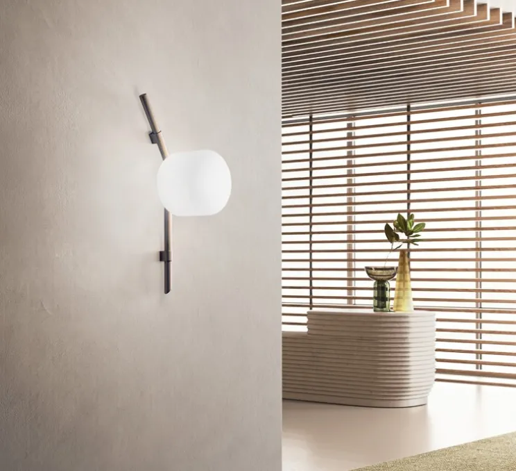 Son diffuseur en verre opalin soufflé double couche est associé à une structure en métal laqué bronze, créant un contraste subtil entre douceur et rigueur. La lumière, douce et enveloppante, se diffuse sans éblouir, apportant une ambiance chaleureuse et raffinée.