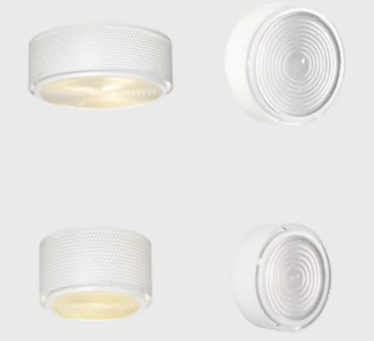 Désigné par le mythique designer Pierre Guariche,il est composé d’une grille en métal perforé et d’une authentique lentille de Fresnel en verre, au sein desquels se diffuse la lumière.