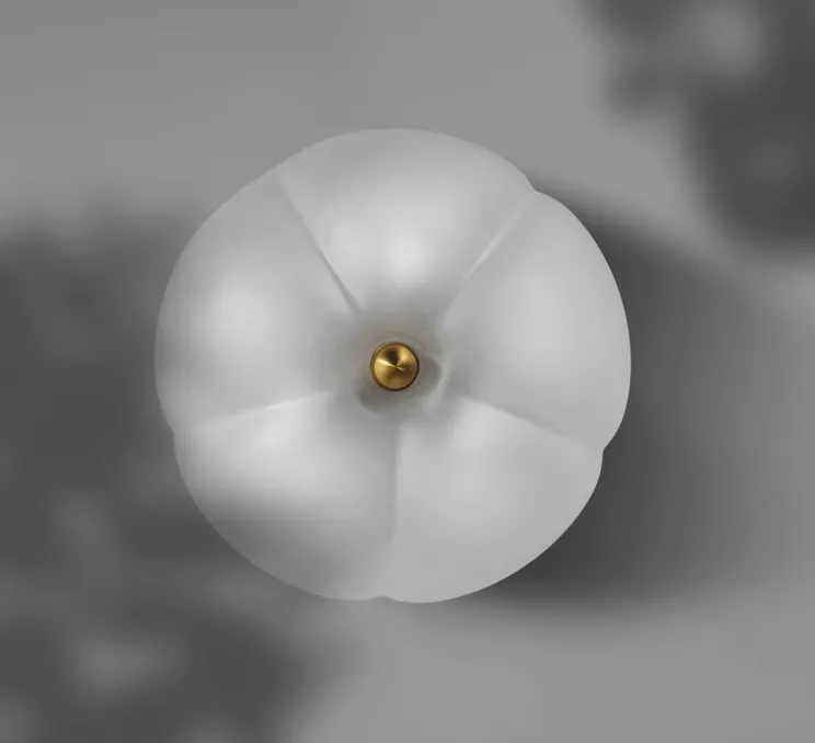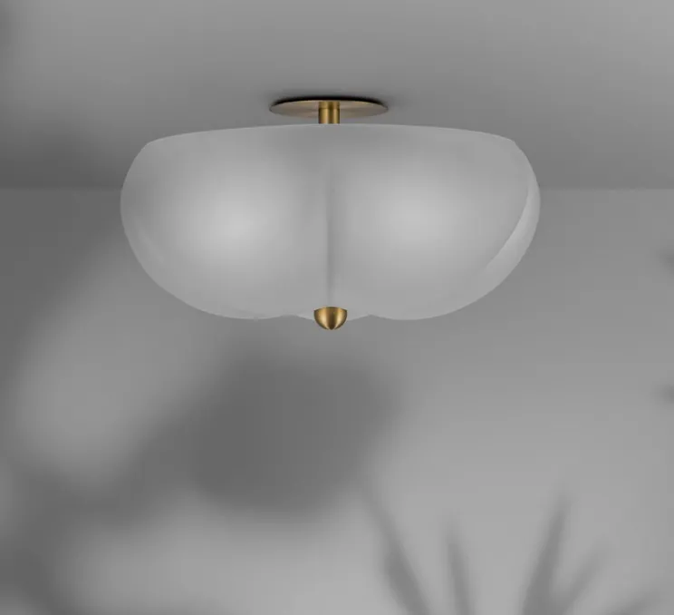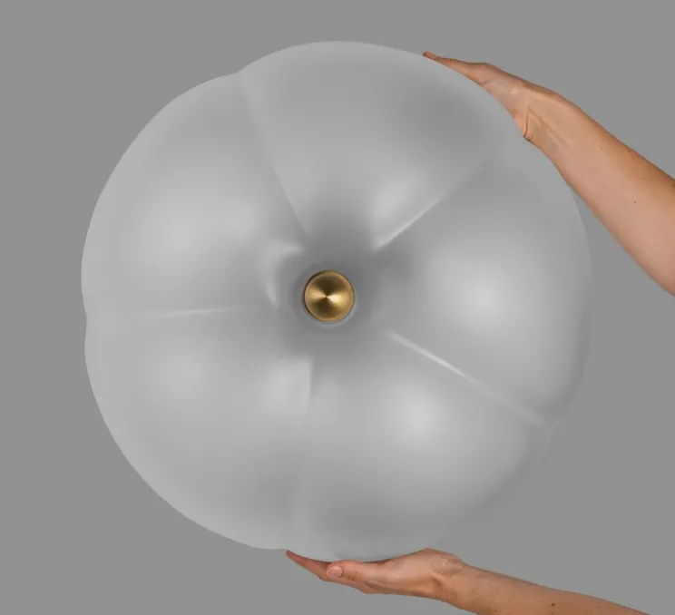 Dans cette version applique/plafonnier, on retrouve le verre dépoli, caractéristique de la maison, ornementé de finitions en laiton. Le mariage subtil entre le verre et le laiton crée une esthétique élégante qui s’intègre harmonieusement dans divers styles d’intérieur. L’élément le plus remarquable de ce luminaire est le motif floral. Le verre forme de délicats pétales qui donnent une impression de fleur en pleine éclosion. Cette conception ajoute une touche de nature et de beauté organique à l’espace.