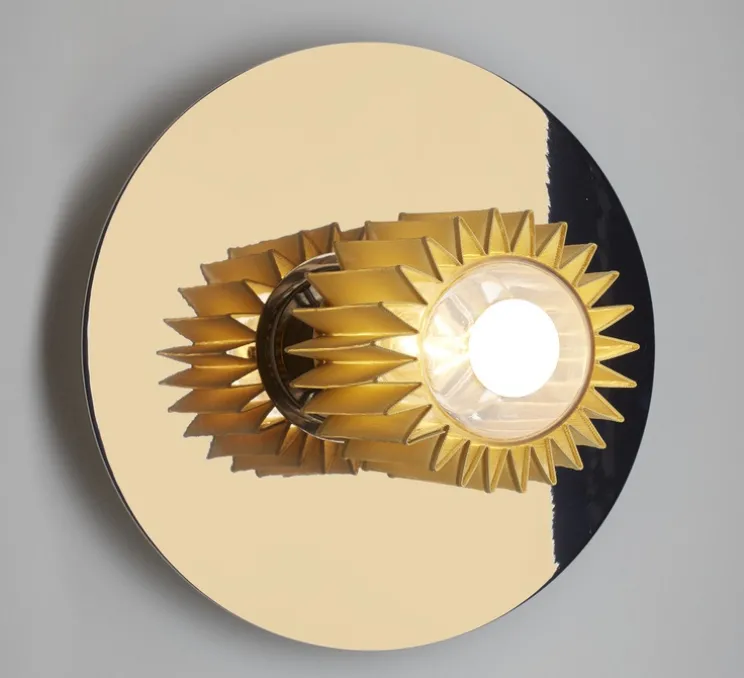 Elle peut faire aussi l’objet d’un plafonnier qui reprend la forme du soleil, l’emblème du monarque. Son design de coloris or apporte une lumière à la fois directe et filtrée à travers la maille avec de somptueux faisceaux lumineux sur le mur.