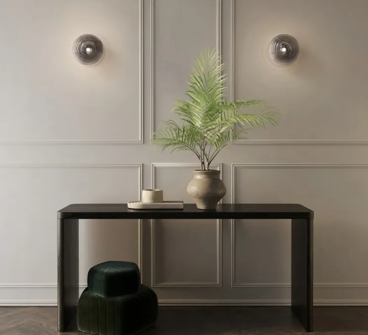 Avec sa base en noir mat et son abat-jour en verre strié fumé soufflé à la main, Tacoma Surface apporte une touche décorative tout en subtilité. Son design sphérique et compact (Ø13,5 cm x P15,4 cm) convient parfaitement aux pièces d’eau, couloirs ou espaces de vie. Le verre texturé crée un jeu de lumière doux et diffus et les abat-jour interchangeables de la gamme offrent une grande liberté de personnalisation.