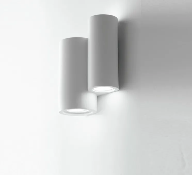 Illuminez et personnalisez vos intérieurs avec l’applique murale en plâtre blanc Isaline Double, de forme cylindrique et prêt à peindre du studio Nedgis !