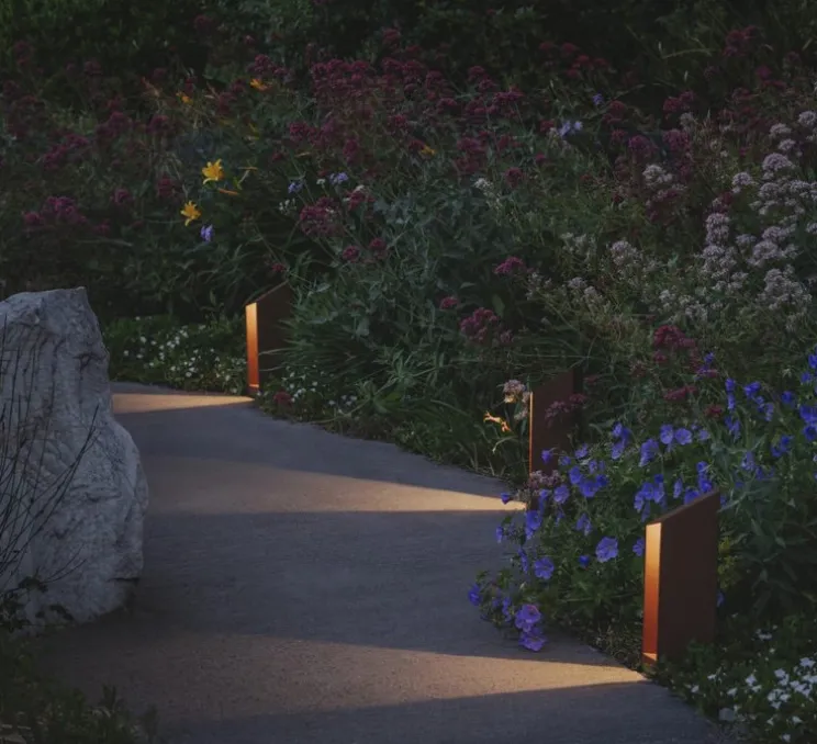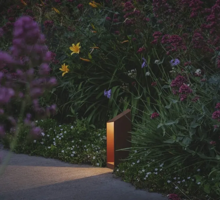 Avec sa silhouette longiligne en finition rouille, Domus B26 affirme un style industriel sobre et architectural. Son design asymétrique révèle un intérieur ajouré, subtil jeu de lumière et de matière. De jour, elle dialogue avec la lumière naturelle ; de nuit, elle crée une ambiance douce et graphique. Installée seule ou en série, elle devient un véritable élément sculptural dans l’aménagement paysager.