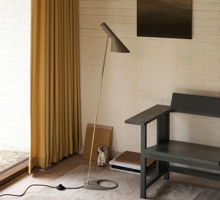 Avec son abat-jour conique orientable et sa silhouette élancée, le lampadaire AJ joue sur les contrastes entre gris mat et laiton doré. Sa forme graphique s’intègre dans des intérieurs contemporains, minimalistes ou inspirés du design scandinave. Placé à côté d’un fauteuil ou dans un coin lecture, il structure visuellement l’espace tout en apportant un point de lumière précis.