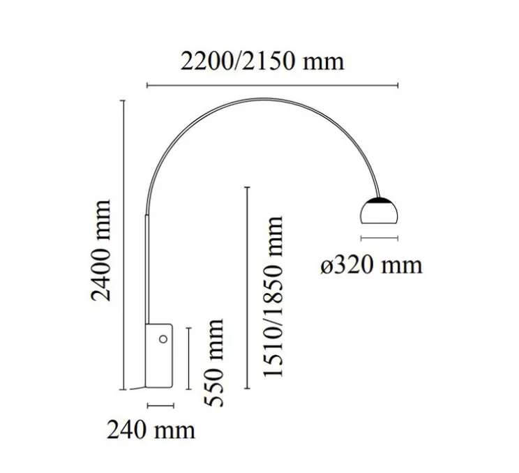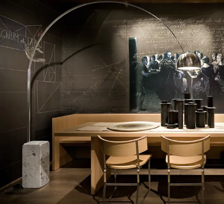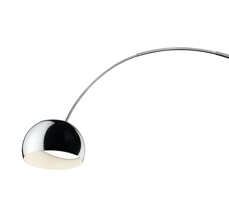 Arco représente l’élégance minimaliste par excellence, dans sa composition rien n’est décoratif, tout a une fonction et utilité propre. Lorsque les deux designers dessinent cette lampe en 1962 ils souhaitent créer un luminaire amenant de la lumière au-dessus d’une table mais laissant une liberté de mouvement autour de celle-ci. Ainsi, une largeur impressionnante de deux mètres sépare la source lumineuse de son pied.
