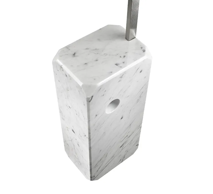 Arco est une prouesse d’équilibre défiant visuellement toute loi de gravité. Son immuabilité trouvent sa source dans une composition parfaitement contrebalancée. Un pied formé d’un bloc en marbre de Carrare -marbre très prisé des frères Castiglioni- duquel s’élance un arc en acier retenant un diffuseur du même matériau. Son diffuseur est perforé à son sommet, laissant s’échapper au plafond un ballet de bulles lumineuses. Ce lampadaire déporte sa lumière idéalement au dessus d’une table de salle à manger ou au cœur d’un salon. Aérienne et épurée, elle apporte chic, modernité et style contemporain à un intérieur.