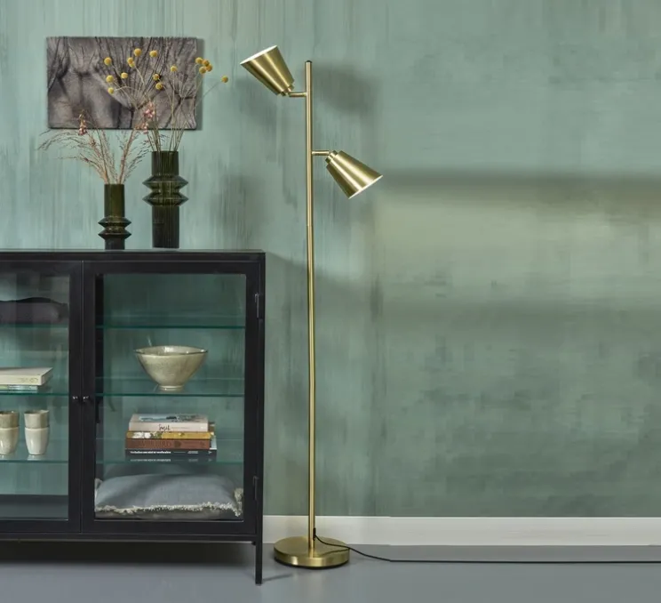 Ce lampadaire composé de deux abat-jours coniques orientables (340° au niveau de l’attache et 90° d’inclinaison de l’abat-jour), en finition or permet d’apporter du caractère à votre intérieur.
